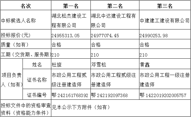松江花園安置小區(qū)(三期)及配套基礎(chǔ)設(shè)施建設(shè)項(xiàng)目室外工程于2022年01月25日在湖北省電子招投標(biāo)交易平臺發(fā)布招標(biāo)公告,2022年02月23日在松滋市開標(biāo)室(2)開標(biāo),并于2022年02月23日完成評標(biāo)工作。根據(jù)評標(biāo)委員會提交的評標(biāo)報(bào)告,湖北松滋金投置業(yè)有限公司已經(jīng)確認(rèn)評標(biāo)結(jié)果,現(xiàn)進(jìn)行評標(biāo)結(jié)果公示。