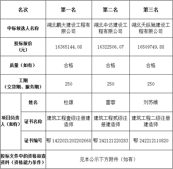 金投?彩虹灣一期(S1號(hào)樓綜合商業(yè))及配套工程于2022年12月19日在湖北省電子招投標(biāo)交易平臺(tái)發(fā)布招標(biāo)公告,2023年01月31日在松滋市開(kāi)標(biāo)室(1)開(kāi)標(biāo),并于2023年01月31日完成評(píng)標(biāo)工作。根據(jù)評(píng)標(biāo)委員會(huì)提交的評(píng)標(biāo)報(bào)告,湖北松滋金投置業(yè)有限公司已經(jīng)確認(rèn)評(píng)標(biāo)結(jié)果,現(xiàn)進(jìn)行評(píng)標(biāo)結(jié)果公示。
