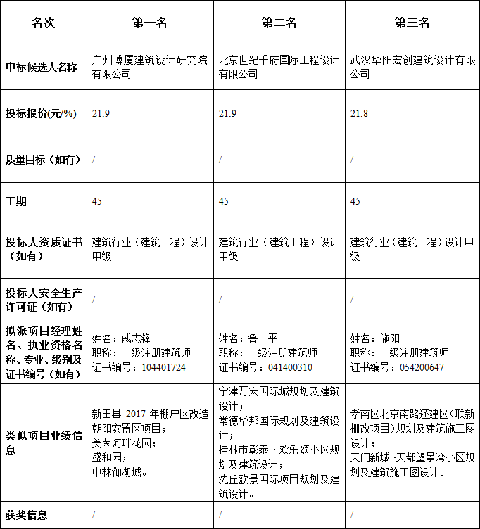 松滋市金投•劃子嘴幸福家園安置小區(qū)及配套設(shè)施建設(shè)項(xiàng)目設(shè)計(jì)于2018年11月24日在湖北公共資源交易信息網(wǎng)發(fā)布招標(biāo)公告,2018年12月24日在松滋市公共資源交易中心開(kāi)標(biāo)。根據(jù)評(píng)標(biāo)委員會(huì)提交的報(bào)告,松滋市金投•劃子嘴幸福家園安置小區(qū)及配套設(shè)施建設(shè)項(xiàng)目設(shè)計(jì)已經(jīng)確認(rèn)開(kāi)標(biāo)結(jié)果,現(xiàn)進(jìn)行中標(biāo)候選人公示。